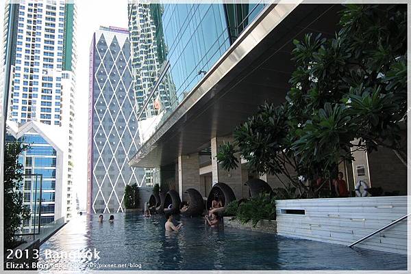 我們只好就先坐在一旁的休息躺椅區 雖然可惜, 但是這個角度拍過去的照片剛好可以拍到泳池全景